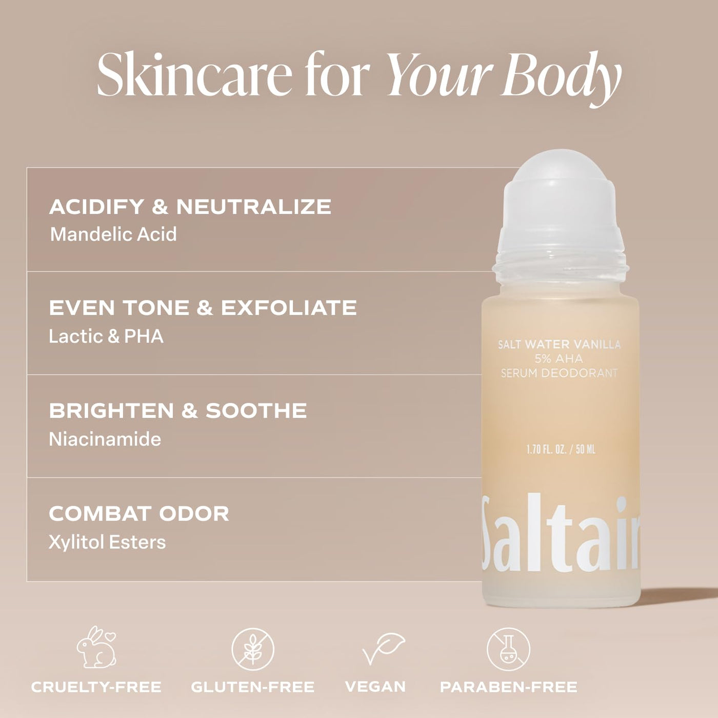 Our clinically tested Salt Water Vanilla 5% AHA deodorant is formulated to combat odor for 48 hours, brighten the look of discoloration, and smooth and reduce the look of ingrown hairs.